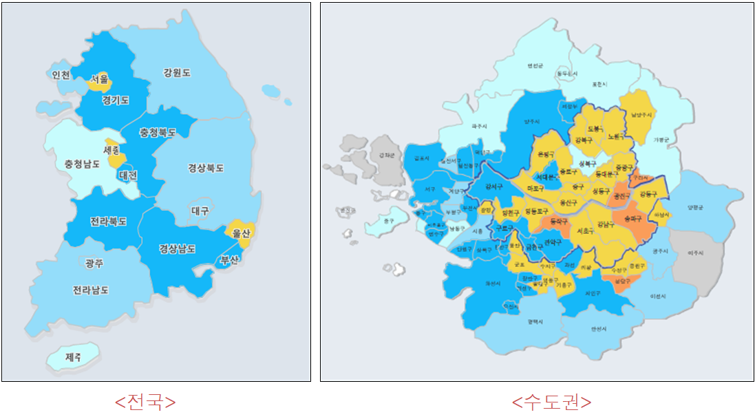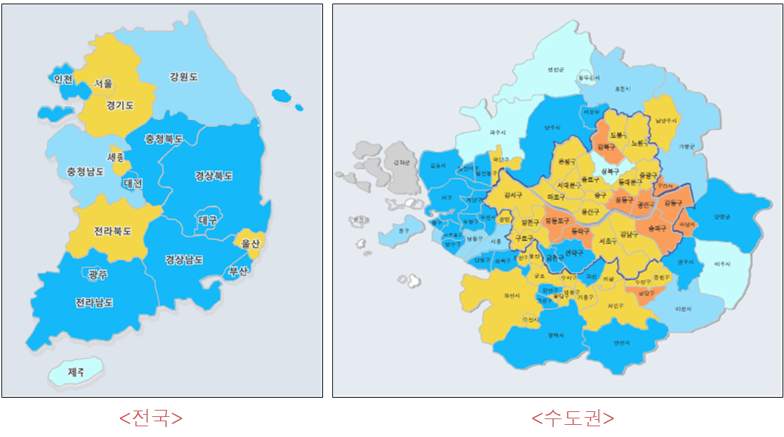 * 수도권 지도는 서울 등 지역별 색상 표현을 위해 작성된 지도로 실제 지도와 지역의 모양, 위치에 차이가 있을 수 있습니다.