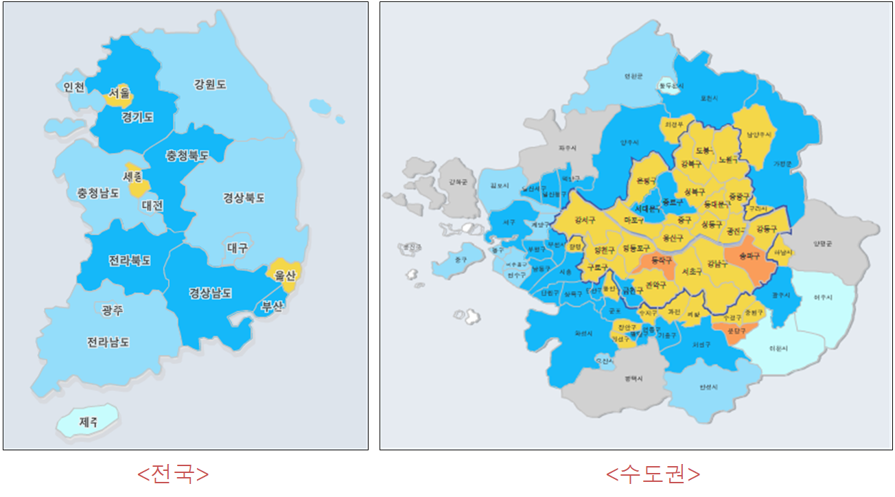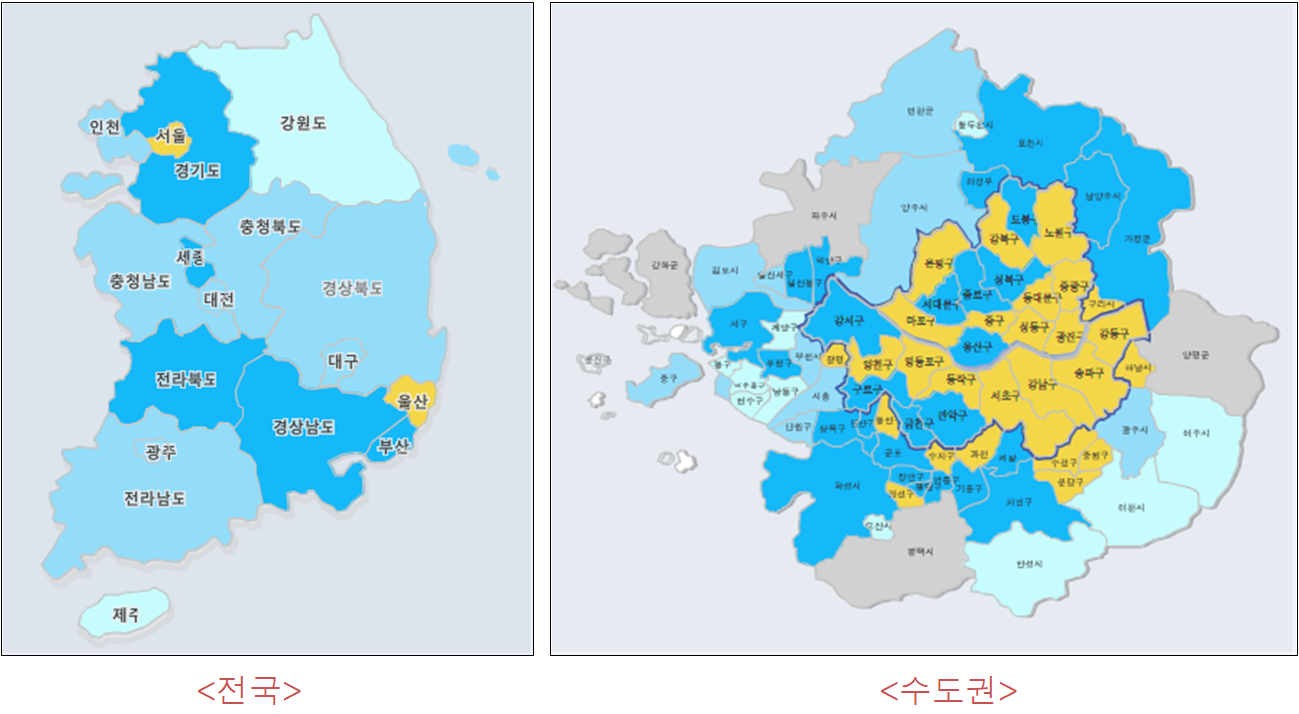 * 수도권 지도는 서울 등 지역별 색상 표현을 위해 작성된 지도로 실제 지도와 지역의 모양, 위치에 차이가 있을 수 있습니다.